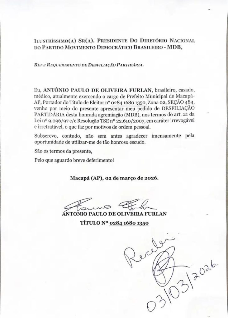 O prefeito de Macapá, Dr. Furlan, anunciou nesta terça-feira (3), em Brasília, sua saída do Movimento Democrático Brasileiro (MDB) e assinou ficha no Partido Social Democrático (PSD). A decisão ocorre em meio às movimentações políticas para as eleições de 2026 no Amapá.